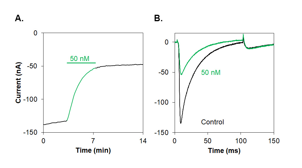 Alomone Labs μ-conotoxin SxIIIC inhibits NaV1.4 channel currents heterologously expressed in Xenopus oocytes.A. Representative time course of μ-conotoxin SxIIIC (#STC-130) inhibition of NaV1.4 channels current. Membrane potential was held at -100 mV, current was elicited by a 100 ms voltage step to 0 mV every 10 sec, and significantly inhibited by application of 50 nM μ-conotoxin SxIIIC (green).
