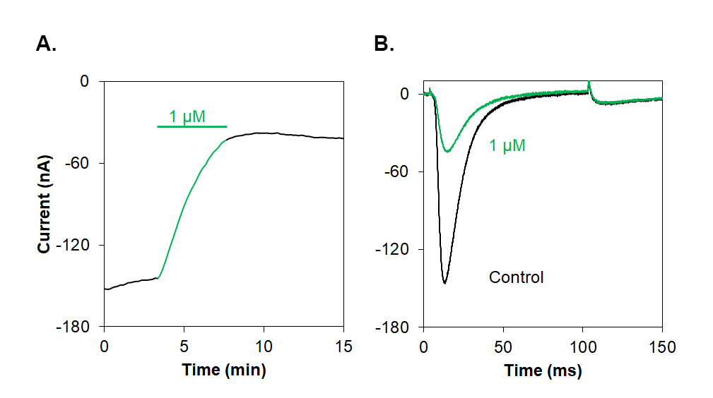 Alomone Labs μ-conotoxin SxIIIC inhibits NaV1.7 channel currents heterologously expressed in Xenopus oocytes.A. Representative time course of μ-conotoxin SxIIIC (#STC-130) inhibition of NaV1.7 channels current. Membrane potential was held at -100 mV, current was elicited by a 100 ms voltage step to 0 mV every 10 sec, and significantly inhibited by application of 1 µM μ-conotoxin SxIIIC (green).