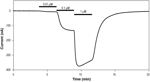 Time course of GABA(A) α1/β2 currents, reversibly activated in a concentration dependent manner by 0.01 µM, 0.1 µM and 1 µM Muscimol hydrobromide (#M-240) while membrane potential was held at -60 mV.