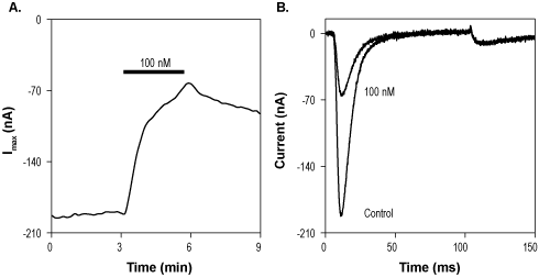 Alomone Labs N-Me-aminopyrimidinone 9 blocks NaV1.7 channels expressed in Xenopus oocytes.A. Time course of NaV1.7 current amplitude and inhibition by 100 nM N-Me-aminopyrimidinone 9 (#N-310). Currents were elicited by application of a 100 ms voltage step to 0 mV (H.P= -70 mV, to induce inactivation), every 10 seconds. B. Superimposed example traces of current responses before and during perfusion of 100 nM N-Me-aminopyrimidinone 9, as indicated.