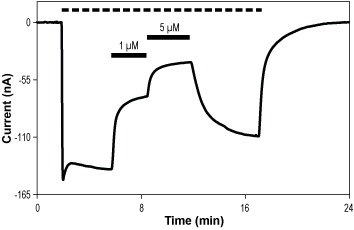 Alomone Labs NBQX inhibits GluA1 channels expressed in Xenopus oocytes.Representative time course of GluA1 current, activated by a continuous application (top dotted line) of 5 µM (S)-AMPA (#A-267), and reversibly inhibited by 1 µM and 5 µM NBQX (#N-185), as indicated (horizontal bars), at a holding potential of -60 mV.