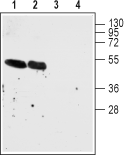 Western blot analysis of mouse brain membranes (lanes 1 and 3) and rat brain membranes (lanes 2 and 4):1-2. Guinea Pig Anti-Nicotinic Acetylcholine Receptor α7 (CHRNA7) (extracellular) Antibody (#ANC-007-GP), (1:500).
