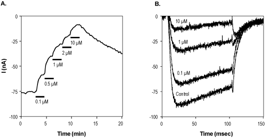 A. Time course of L-type channel (CaV1.2+α2δ1+β1a) activity before and during applications of 0.1, 0.5, 1, 2, and 10 μM Nifedipine (#N-120) as indicated, and upon wash.  Holding potential was -80 mV and currents were elicited every 10 seconds by 100 ms ramp to +50 mV. B. Superimposed current traces of L-type channels (CaV1.2+α2δ1+β1a), before and during applications of 0.1, 1 and 10 μM Nifedipine as indicated.  Holding potential was -100 mV and currents were elicited every 10 seconds by 100 ms steps to +10 mV.