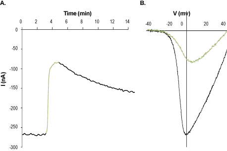 Alomone Labs Nimodipine blocks L-type Ca2+ currents in Xenopus oocytes.A. Time course of L-type channel (CaV1.2+α2δ1+β1a) activity before and during applications of 10 μM Nimodipine (#N-150) (green) and upon wash. Holding potential was -80 mV and currents were elicited every 10 seconds by 100 ms ramp to +50 mV. B. Superimposed example current traces (plotted against the corresponding ramp voltage) before and during application of 10 μM Nimodipine in green (taken from the experiment described in A).