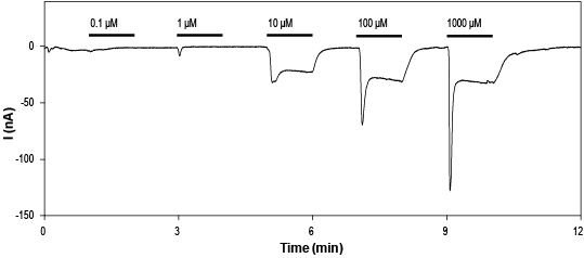 Alomone Labs NMDA activates NMDA (GluNR1+GluNR2c) receptor channels heterologously expressed in Xenopus oocytes.Continuous current trace of NMDA receptor channel activity at 0 mV holding potential. NMDA (#N-170) was applied at concentrations of 0.1 to 1000 µM, and the horizontal bars above the trace represent periods of NMDA perfusion.