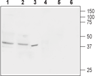 Western blot analysis of rat brain (lanes 1 and 4), mouse brain (lanes 2 and 5) and U-87 MG (lanes 3 and 6) lysates:1,2. Anti-Nociceptin Receptor (OPRL1) Antibody (#AOR-015), (1:600).