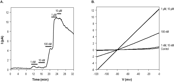 Alomone Labs NS-309 enhances KCa3.1 channel currents in HEK293T cells.A. Time course of KCa3.1 channel activity at -10 mV demonstrating the dose-dependent effects of 1 nM -10 μM NS-309 (#N-180). B. Representative current traces under control conditions and following application of 1 nM - 10 μM NS-309. Currents were elicited by a 150 ms voltage ramp from -120 to 60 mV every 10 seconds from a holding potential of -80 mV (current responses are shown between -120 and 0 mV).