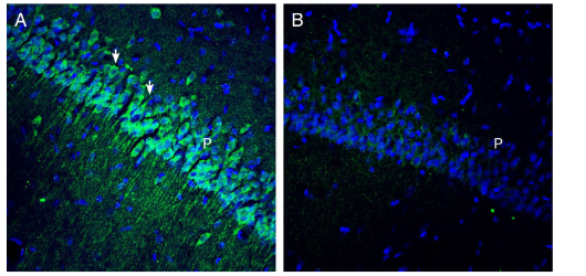 Expression of OCTN1 in rat hippocampus.Immunohistochemical staining of perfusion-fixed frozen mouse brain sections with Anti-OCTN1/SLC22A4 Antibody (#ACT-014), (1:1200), followed by goat anti-rabbit-AlexaFluor-488. A. OCTN1 immunoreactivity (green) appears in neuronal profiles in the pyramidal layer (P, arrows). B. Pre-incubation of the antibody with OCTN1/SLC22A4 Antibody Blocking Peptide (BLP-CT014), suppressed staining. Cell nuclei are stained with DAPI (blue).