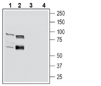 Western blot analysis of mouse brain membranes (lanes 1 and 3) and rat brain membranes (lanes 2 and 4):1-2. Anti-OCTN1/SLC22A4 Antibody (#ACT-014), (1:600).