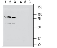 Western blot analysis of human THP-1 monocytic leukemia cell line lysates (lanes 1 and 4), mouse BV-2 microglia cell line lysates (lanes 2 and 5) and human HeLa cervix adenocarcinoma cell line lysates (lanes 3 and 6):1-3. Anti-OCTN1/SLC22A4 Antibody (#ACT-014), (1:400).