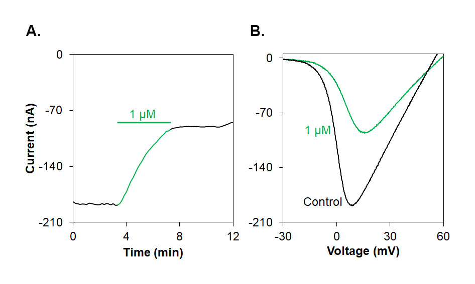 Alomone Labs ω-conotoxin MoVIA inhibits CaV2.2 channel currents heterologously expressed in Xenopus oocytes.A. Representative time course of ω-conotoxin MoVIA (#STC-150) inhibition of CaV2.2 (α1B + α2δ1 + β1) channels current. Membrane potential was held at -100 mV, current was elicited by a 100 ms voltage ramp to +60 mV every 10 sec, and inhibited by 1 µM ω-conotoxin MoVIA (green).