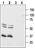 Western blot analysis of human Colo-205 (lanes 1 and 3) and HT-29 (lanes 2 and 4) colon cancer cell lines:1,2. Anti-Orexin Receptor 1 Antibody (#AOR-001), (1:500).