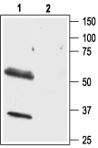 Western blot analysis of rat brain membranes (lanes 1 and 3) and mouse brain lysate (lanes 2 and 4):1-2. Guinea Pig Anti-Orexin Receptor 1 Antibody (#AOR-001-GP), (1:200).