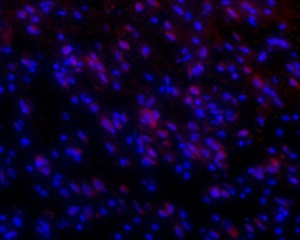 Expression of OX1R in rat brainLongitudinal frozen section of rat brainstem showing staining (red) in neuronal cell bodies. Slides were incubated overnight at 4°C with Anti-Orexin Receptor 1 Antibody (#AOR-001), (1:50) followed by goat-anti-rabbit-AlexaFluor-555 secondary antibody (1:500). Hoechst 33342 is used as a counterstain (blue).