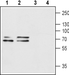 Western blot analysis of rat brain (lanes 1 and 3) and mouse brain (lanes 2 and 4) lysates:1,2. Anti-P2X1 Receptor (extracellular) Antibody (#APR-022), (1:200).