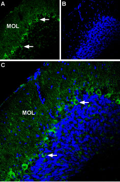 Expression of P2X1 Receptor in mouse cerebellumImmunohistochemical staining of mouse cerebellum using Anti-P2X1 Receptor (extracellular) Antibody (#APR-022). A. Most of P2RX1 labeling (green) appears in fine processes in the molecular layer (MOL) and in Purkinje cells (arrows show examples). B. DAPI is used as the counterstain (blue). C. Merge of A and B.