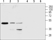 Western blot analysis of rat brain (lanes 1 and 4), Jurkat (lanes 2 and 5) and K-562 (lanes 3 and 6) lysates:1-3. Anti-P2Y1 Receptor (extracellular) Antibody (#APR-021), (1:200).