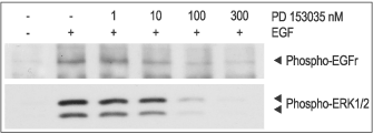 Alomone Labs PD 153035 inhibits EGF receptor activation in 3T3-L1 cells.Cells were serum starved for 3 h and preincubated with different concentrations of PD 153035 (#P-360) for 2 h. The cells were then stimulated with 200 ng/ml EGF for 10 minutes. Cell proteins were resolved by SDS-PAGE and probed with anti-phospho-EGFr (upper panel) and with anti-phospho ERK1/2 (lower panel).