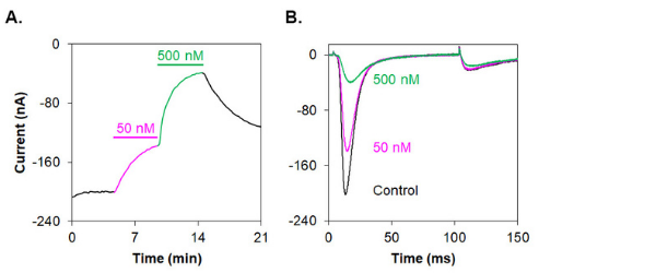 Alomone Labs Pe1b inhibits NaV1.7 channel currents heterologously expressed in Xenopus oocytes.A. Representative time course of Pe1b (#STP-050) inhibition of NaV1.7 channels current. Membrane potential was held at -100 mV, current was elicited by a 100 ms voltage step to 0 mV every 10 sec, and significantly inhibited by application of 50 nM (magenta) and 500 nM (green) Pe1b.