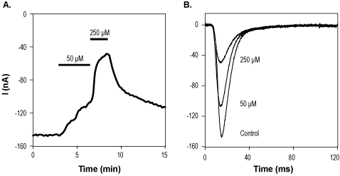 Alomone Labs Phenytoin inhibits NaV1.2 channel currents in Xenopus oocytes.A. Time course of current reversible inhibition by 50 and 250 µM Phenytoin (#P-235), as measured at peak current amplitude. Currents were elicited by a voltage step protocol from a holding potential of -60 mV to -10 mV delivered every 10 seconds. B. Example traces of current responses before and during 50 and 250 µM Phenytoin application.