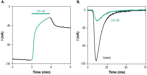 Alomone Labs Phrixotoxin-3 blocks NaV1.2 channels expressed in Xenopus oocytes.A. Time course of Phrixotoxin-3 (#STP-720) action on NaV1.2 peak current amplitude. Peak current amplitudes were plotted as a function of time. Membrane potential was held at -100 mV and oocytes were stimulated by a 100 ms voltage step to 0 mV. 250 nM Phrixotoxin-3 were perfused as indicated by the bar (green) for 160 sec. B. Superimposed examples of NaV1.2 channel maximum peak current in the absence (control) and presence (green) of 250 nM Phrixotoxin-3 (taken from the experiment in A).