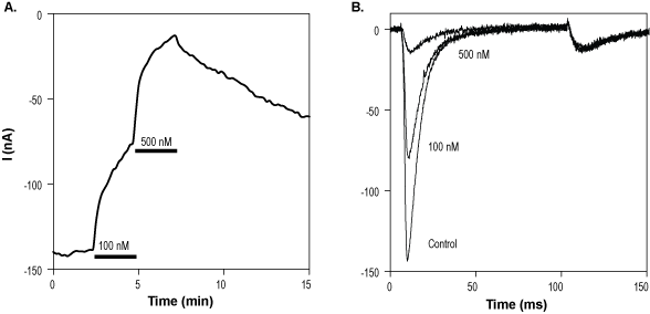 Alomone Labs Phrixotoxin-3 blocks NaV1.6 channels expressed in Xenopus oocytes.A. NaV1.6 currents were elicited by a 100 ms voltage step from a holding potential of -100 mV to -10 mV every 10 sec. Phrixotoxin-3 (#STP-720), applied at 100 nM and 500 nM, as indicated (bars), inhibits Nav1.6 currents in a concentration dependent manner. B. Superimposed NaV1.6 current traces (taken from the experiment in A) upon application of control, or of 100 nM and 500 nM Phrixotoxin-3 (as indicated).