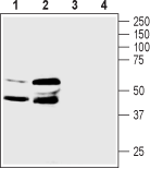 Western blot analysis of rat kidney (lanes 1 and 3) and pancreas (lanes 2 and 4) membranes:1,2. Anti-Prostaglandin E Receptor EP3 (PTGER3) Antibody (#APR-065), (1:200).