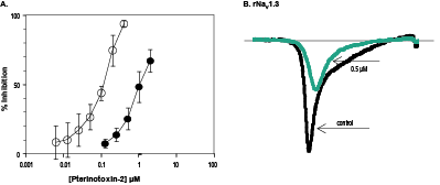 Alomone Labs Pterinotoxin-2 inhibits rNav1.3 and hNaV1.7 channels heterologously expressed in HEK293 cells.A. Dose-response of NaV channels inhibition by Pterinotoxin-2 (#STT-150). The inhibition was measured in 3-5 cells for each dose in rat Nav1.3 channels expressed in HEK cells (open circles) and 3-5 cells for human NaV1.7 expressed in HEK cells (filled circles). B. Example of superimposed current traces of rat NaV1.3 channel activity before (black) and during (green) application of the indicated concentration of 0.5 µM Pterinotoxin-2. Holding potential was -100 mV and currents were stimulated every 10 seconds by a voltage ramp of 40 msec from holding potential to +60 mV.