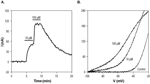 Alomone Labs Retigabine dihydrochloride modulates KCNQ2/KCNQ3 voltage-gated K+ currents expressed in Xenopus oocytes.A. Time course of KCNQ2/KCNQ3 current enhancement by 10 and 100 µM Retigabine dihydrochloride (#R-101) as measured at -50 mV. Currents were elicited by application of voltage ramp from a holding potential of -100 mV to 0 mV (800 msec). B. Superimposed example traces of current responses before and during perfusion of 10 and 100 µM Retigabine dihydrochloride, as indicated.