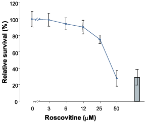 Alomone Labs Roscovitine prevents NGF-mediated survival of PC-12 cells.Cells were grown in the absence of serum. The cells were not protected (dotted line) or protected (continuous line) from apoptosis with 100 ng/ml Native mouse NGF 2.5S protein (99%) (#N-240) and treated with different concentrations of Roscovitine (#R-300). Cell survival was measured after 4 days using the XTT method, calculated as a relative percentage of the control without Roscovitine and plotted against Roscovitine concentrations. The basal level of survival without NGF is represented by the gray column.