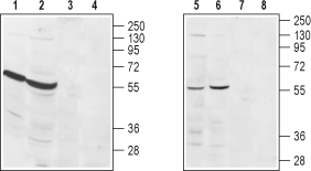 Western blot analysis of rat heart (lanes 1 and 3), rat kidney (lanes 2 and 4), human Jurkat acute T cell leukemia (lanes 5 and 7) and mouse WEHI B cell lymphoma (lanes 6 and 8) lysates:1,2,5,6. Anti-S1PR3 (EDG3) (extracellular) Antibody (#ASR-013), (1:200).