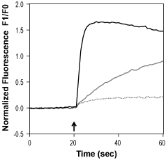 Alomone Labs SB-366791 inhibits TRPV1 channels expressed in C6 cells.mTRPV1-C6 cells were loaded with Fluo-3 AM. Changes in intracellular Ca2+ were detected via changes in Fluo-3 emission following agonist application. 10 minutes pre-incubation with 5 and 50 µM SB-366791 (#S-180) inhibited 10 µM Capsaicin (#C-125)-evoked rise in intracellular Ca2+. Normalized fluorescence before and after application (arrow) of 10 µM Capsaicin in cells pre-incubated with 0 nM (DMSO equivalent control, black), 5 µM (gray) or 50 µM SB-366791 (dotted line).