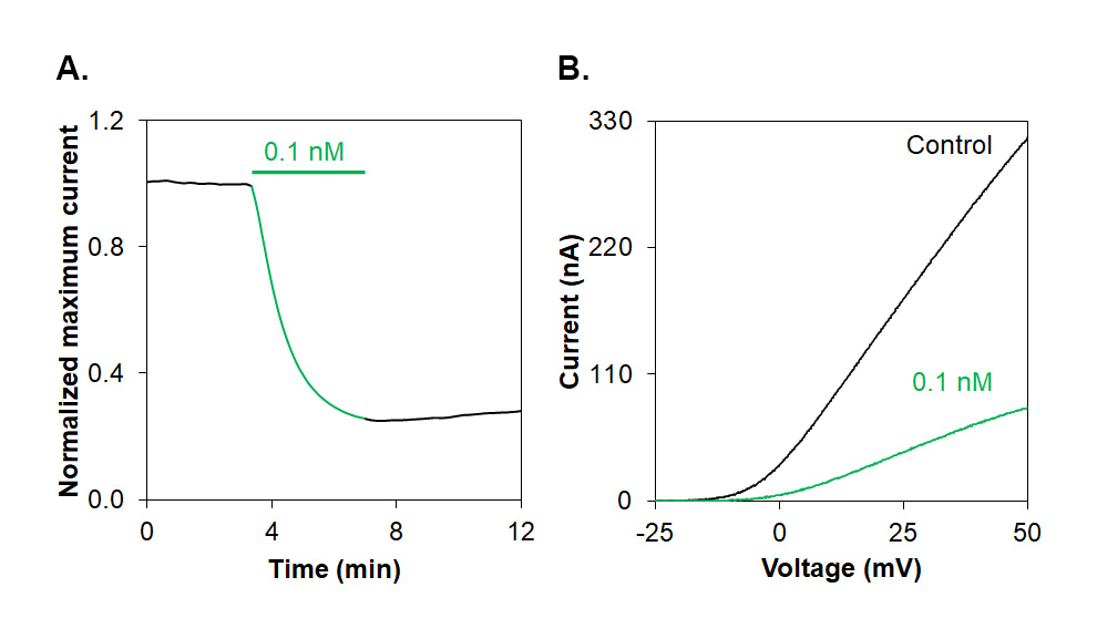 Alomone Labs ShK-186 blocks KV1.3 channels expressed in Xenopus oocytes.A. Representative time course of ShK-186 (#STS-390) inhibition of normalized KV1.3 current. Membrane potential was held at -100 mV, current was elicited by a 100 ms voltage ramp to +50 mV every 10 sec, and significantly inhibited by 0.1 nM (green) ShK-186.