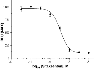 Alomone Labs Sitaxsentan inhibits ET-A receptor-mediated Ca2+ mobilization in CHO cells.Dose response plot of Sitaxsentan (#S-186) inhibition of the ET-A receptor-mediated, Endothelin-1-evoked Ca2+ mobilization. IC50 was determined at 11.67 nM. Cells were loaded with Calcium 6 dye, incubated with Sitaxsentan, and stimulated with 15 nM Endothelin-1 (EC80). Changes in intracellular Ca2+ levels were detected as changes in maximum relative fluorescence (RLU) using FLIPRTETRA™.