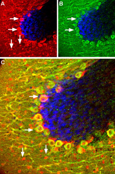 Expression of SSTR5 in mouse cerebellumImmunohistochemical staining of Somatostatin receptor 5 (SSTR5) in mouse cerebellum using Anti-Somatostatin Receptor Type 5 (extracellular) Antibody (#ASR-005). A. SSTR5 (red) appears in Purkinje cells (horizontal arrows) and in molecular layer interneurons (vertical arrows). B. Parvalbumin (green) appears in the Purkinje cells and their processes. C. merge of SSTR5 and parvalbumin demonstrates co-localization in Purkinje cells (horizontal arrows) but not in the molecular layer (vertical cells). DAPI is used as the counterstain (blue).