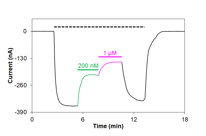 Alomone Labs Tertiapin-RQ blocks Kir1.1 channels expressed in Xenopus oocytes.Representative time course of Kir1.1 current, stimulated by a continuous application (top dotted line) of high K+ concentration, and reversible inhibition by 200 nM (green) and 1 µM (magenta) Tertiapin-RQ (#STT-180), at a holding potential of -80 mV.