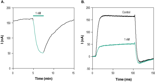 Alomone Labs Tityustoxin-Kα inhibits KV1.2 currents in Xenopus oocytes.A. Time course of Tityustoxin-Kα (#STT-360) action on KV1.2 currents. Plateau current amplitudes were plotted as a function of time. Membrane potential was held at –100 mV and oocytes were stimulated by a 100 ms voltage step to +20 mV. 1 nM Tityustoxin-Kα was perfused as indicated by the bar (green). B. Superimposed examples of KV1.2 channel current in the absence (control) and presence of 1 nM Tityustoxin-Kα (taken from the experiment in A).