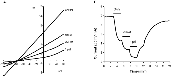 Alomone Labs TRAM 34 blocks KCa3.1 currents in stably transfected 293T cells.Currents were elicited by 150 ms voltage ramp from -120 mV to +60 mV, applied every 10 sec using whole-cell voltage clamp technique (Vh -80 mV). A. Superimposed traces of KCa3.1 currents (plotted against the ramp voltage) measured under control conditions and following 2 minutes perfusion of 50 nM, 250 nM, and 1 μM TRAM 34 (#T-105) as indicated. B. Time course of KCa3.1 current (at 0 mV) amplitude change as a result of the application of raising concentrations of TRAM 34 (perfusion duration indicated by the horizontal bar, concentration as indicated).