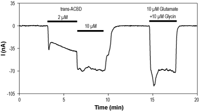 Alomone Labs trans-ACBD activates NMDA receptors (NR1+NR2A) expressed in Xenopus oocytes.Time course of NMDA receptor current activation by 2 and 10 μM trans-ACBD (#A-280) (at -80 mV). For comparison, a solution containing 10 µM glutamate and 10 µM glycine was applied for 2.5 min resulting in currents of comparable amplitude (as indicated). Amplitude change as a result of the application of raising concentrations of trans-ACBD (perfusion duration indicated by the horizontal bar, concentration as indicated).