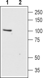Western blot analysis of rat brain lysates:1. Anti-TRPC6 (extracellular) Antibody (#ACC-120), (1:200).