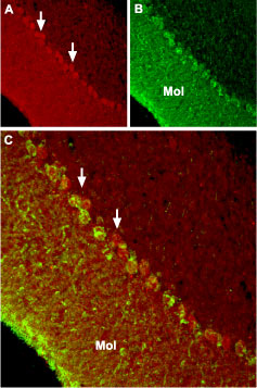 Expression of TRPC6 in mouse cerebellumImmunohistochemical staining of mouse cerebellum using Anti-TRPC6 Antibody (#ACC-017). A. TRPC6 (red) appears in Purkinje cells (arrows) and in the molecular (Mol) layer. B. Staining with mouse anti parvalbumin in the same brain section. C. Confocal merge of TRPC6 and PV demonstrates partial co-localization in the Purkinje and the molecular layers.