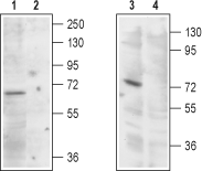 Western blot analysis of rat kidney (lanes 1 and 2) and HEK-293 cells (lanes 3 and 4) lysates:1,3. Anti-TRPML1 (Mucolipin 1) Antibody (#ACC-081), (1:200).
