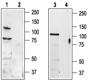 Western blot analysis of rat DRG (lanes 1 and 2) and brain (lanes 3 and 4) lysates:1,3. Anti-TRPV3 (extracellular) Antibody (#ACC-033), (1:200).