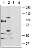 Western blot analysis of rat kidney (lanes 1 and 3) and human PC3 prostate cancer cell line (lanes 2 and 4) lysates:1,2. Anti-TRPV5 Antibody (#ACC-035), (1:200).