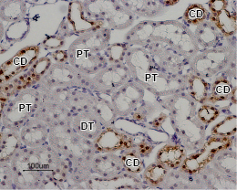Expression of TRPV5 in rat kidneyImmunohistochemical staining of rat kidney paraffin embedded section using Anti-TRPV5 Antibody (#ACC-035), (1:100). TRPV5 is expressed in collecting ducts (CD) in the renal cortex. Note that both proximal tubules (PT) and distal tubules (DT) are negative. Hematoxilin is used as the counterstain.- Mouse kidney sections (Loh, N.Y. et al. (2013) PLoS ONE 8, e55412.).