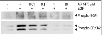 Alomone Labs Tyrphostin AG 1478 inhibits EGF receptor activation in 3T3-L1 cells.Cells were serum-starved for 3 h. The cells were then incubated for 2 h with various concentrations of Tyrphostin AG 1478 (#T-320) and stimulated with 200 ng/ml EGF for 10 min. Cell proteins were resolved by SDS-PAGE and probed with anti-phospho-EGFr (upper panel) and with anti-phospho ERK1/2 (lower panel).