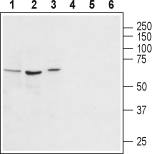 Western blot analysis of rat kidney (lanes 1 and 4), rat pancreas (lanes 2 and 5) and mouse heart (lanes 3 and 6) lysates:1-3. Anti-Vasopressin V1A Receptor (AVPR1A) Antibody (#AVR-010), (1:400).