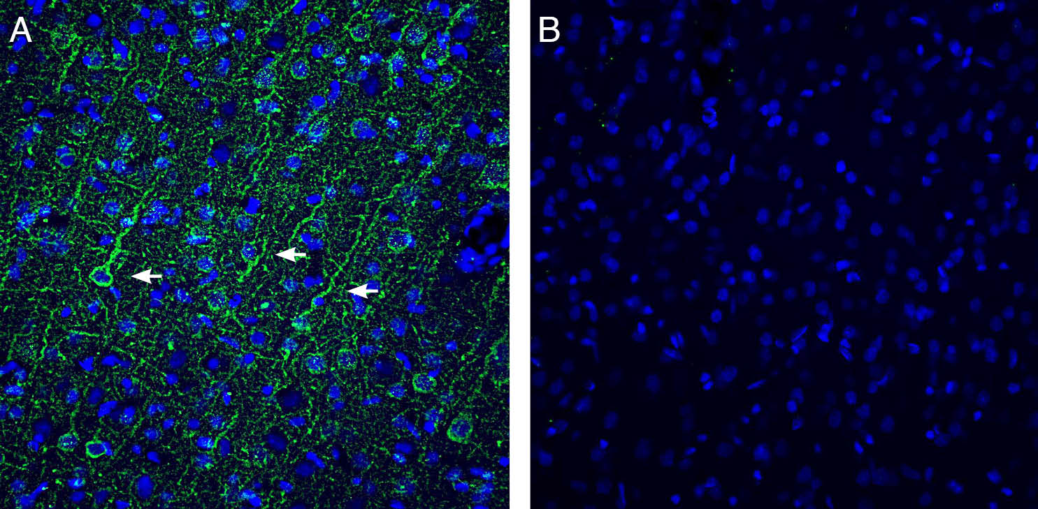Expression of Vasopressin V1A Receptor in rat horizontal diagonal band.Immunohistochemical staining of perfusion-fixed frozen rat brain sections with Anti-Vasopressin V1A Receptor (AVPR1A) Antibody (#AVR-010), (1:200), followed by goat anti-rabbit-AlexaFluor-488. A. Vasopressin V1A Receptor immunoreactivity (green) appears in outlines of neurons (arrows). B. Pre-incubation of the antibody with Vasopressin V1A Receptor (AVPR1A) Blocking Peptide (BLP-VR010), suppressed staining. Cell nuclei are stained with DAPI (blue).