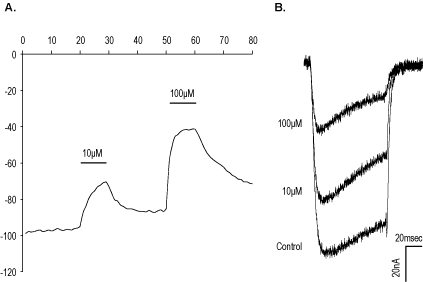 Alomone Labs Verapamil HCl inhibits L-type Ca2+ currents in Xenopus oocytes.A. Time course of L-type channel (CaV1.2+α2δ1+β1a) activity before and during applications of 10 and100 μM Verapamil HCl (#V-100) and upon wash (Verapamil HCl application periods are indicated by the horizontal bars). Holding potential was -100 mV and currents were elicited every 10 seconds by 100 ms steps to -10 mV. X axis in minutes and Y axis in nA. B. Example current traces before and during applications of 10 and 100 μM Verapamil HCl (concentrations indicated are taken from the experiment described in A).