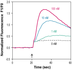 Alomone Labs WKYMVm activates Ca2+ transients in HL-60 cells.Non-differentiated HL-60 cells were loaded with Fluo-3 AM. Changes in intracellular Ca2+ were detected via changes in Fluo-3 emission following application of WKYMVm (#GPW-105) at different concentrations. Normalized fluorescence before and after application (indicated by arrow) of 1 nM, 10 nM and 100 nM WKYMVm are shown compared to control (black).
